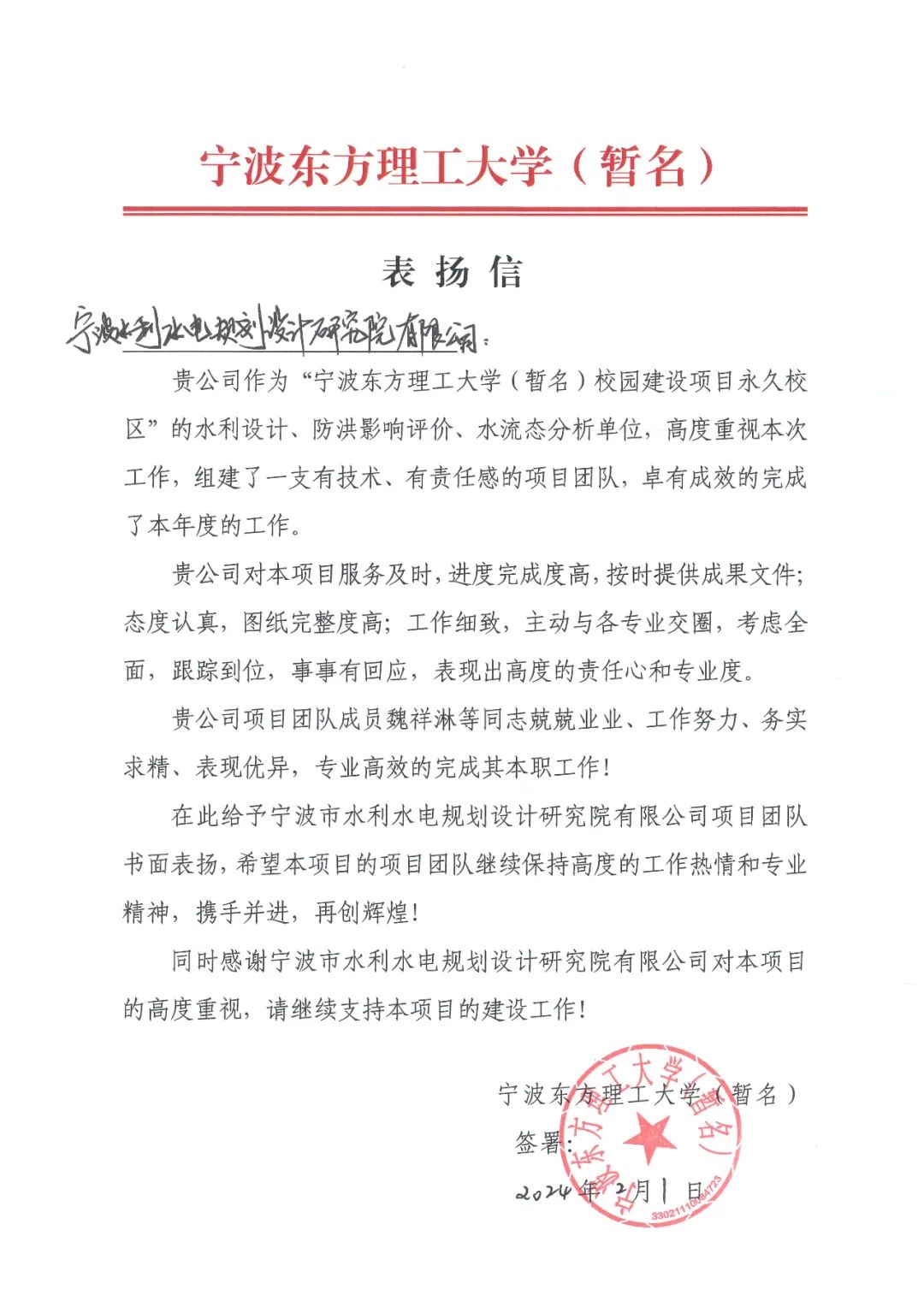 發(fā)布日期:2024.02.07 辭舊迎新之際,寧波市水利院收到寧波東方理工大學(xué)的感謝信。信中提到,我院在寧波東方理工大學(xué)(暫名)校園永久校區(qū)建設(shè)項(xiàng)目中,派出的項(xiàng)目團(tuán)隊(duì)高效、專(zhuān)業(yè)、及時(shí)地做好技術(shù)支撐服務(wù)工... -