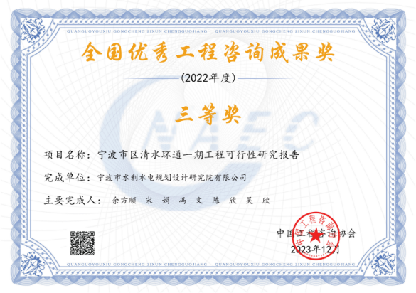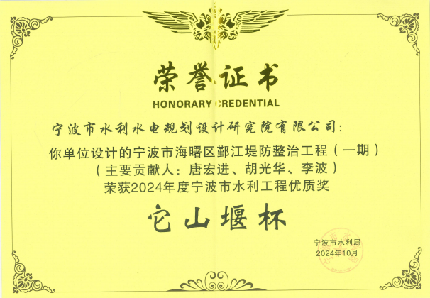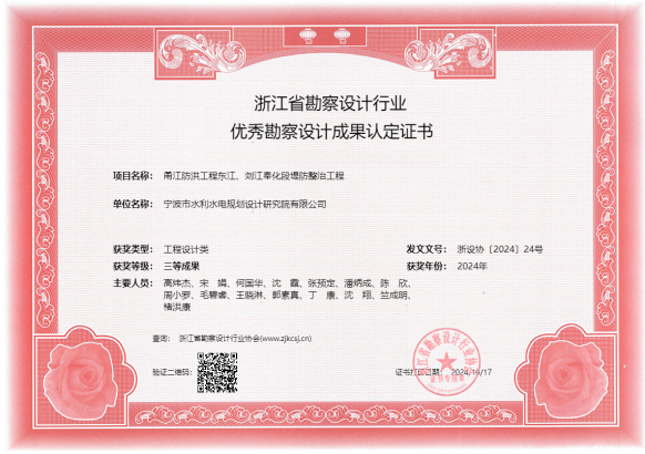 在工程項目方面,獲得2022年度全國優(yōu)秀工程咨詢成果獎、2024年度寧波市優(yōu)秀勘察設計獎、2024年浙江省勘察設計行業(yè)優(yōu)秀勘察設計”綜合類成果獎、寧波市優(yōu)秀水利工程設計二等獎、“浙江省文明標化工地”稱號、“2024年度寧波軌道交通市域鐵路工程立功競賽先進集體”等各類獎項十余項。