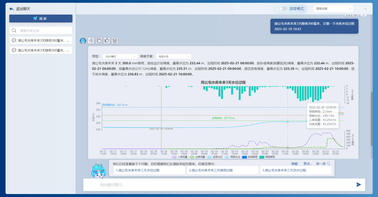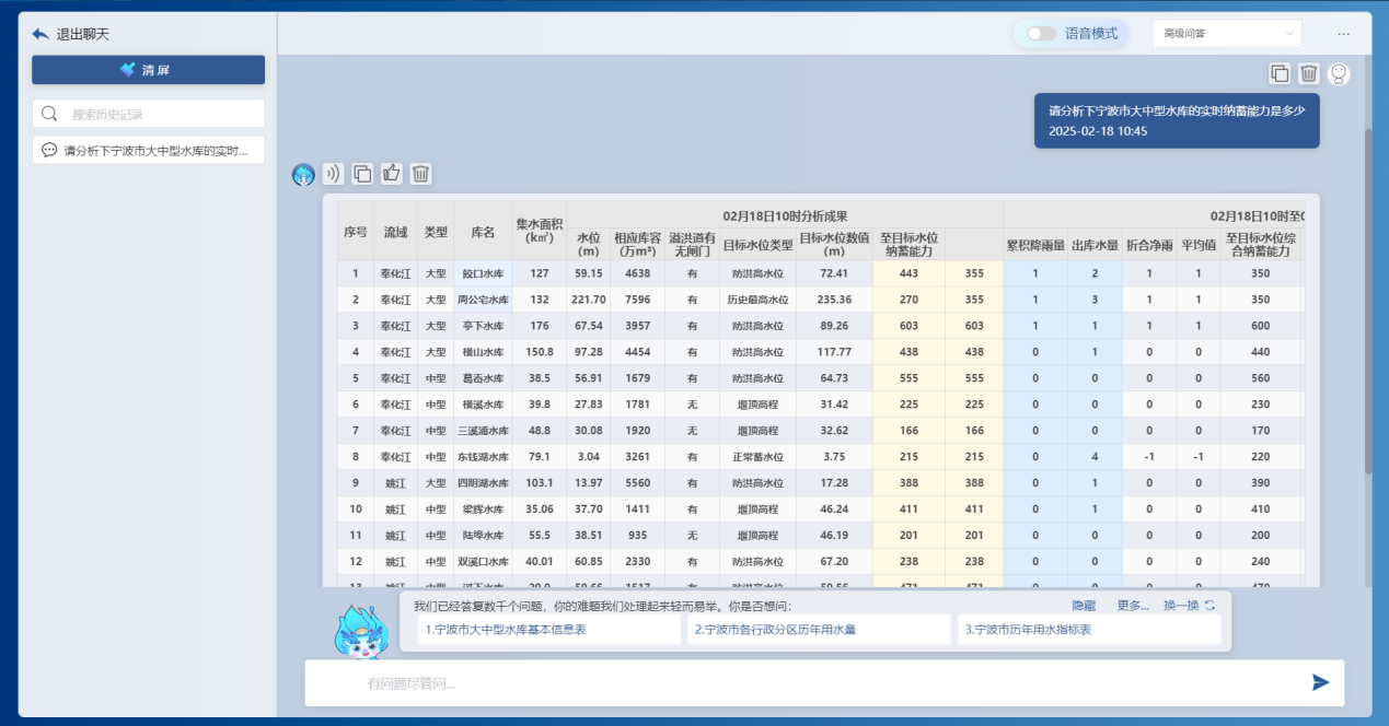 基于前端感知的降雨、水位、流量、工程運(yùn)行等實(shí)時信息,借助DeepSeek大模型和“甬水院智算”算法庫,能夠?qū)崟r對流域防汛形勢進(jìn)行快速分析,包括降雨形勢、水情預(yù)警、預(yù)泄分析、水庫納蓄分析等,可以按照規(guī)定的表單形式一鍵輸出成果,為防汛防洪工作提供兼具前瞻性、科學(xué)性、精準(zhǔn)性、安全性的決策支撐。相關(guān)學(xué)術(shù)成果曾以《基于大模型的水利防汛智能問答關(guān)鍵技術(shù)研究與應(yīng)用探索》為題于去年8月的第七屆城市水安全與水管理學(xué)術(shù)交流會作專題匯報。