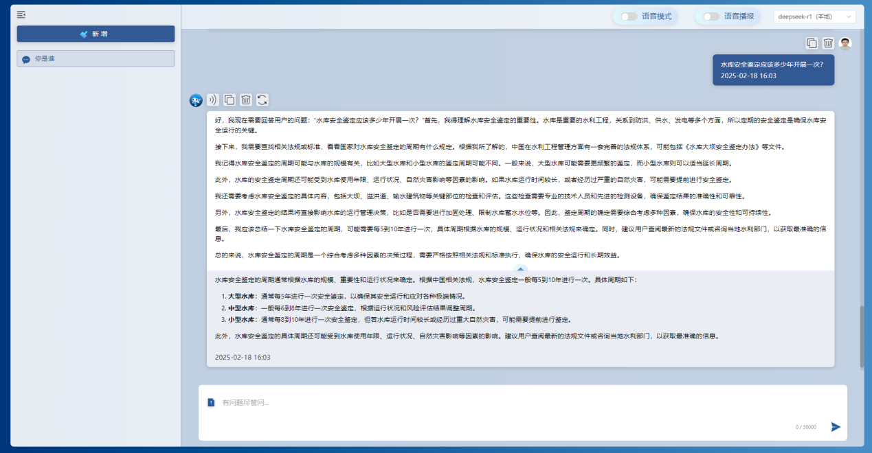 基于本地部署的DeepSeek-r1模型和私域知識庫,通過該工具能夠?qū)崿F(xiàn)對水利行業(yè)的水旱災(zāi)害防御、水資源管理、水工程管理、水生態(tài)保護(hù)等各領(lǐng)域知識的高效檢索問答,節(jié)省大量查閱資料的時間,提高工作效率。