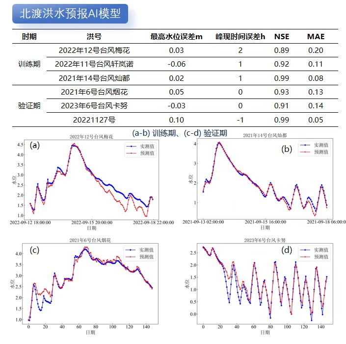 利用成熟水利專業(yè)模型模擬計(jì)算不同降雨潮位邊界條件下的洪水過程數(shù)據(jù),再基于DeepSeek對海量洪水模擬數(shù)據(jù)成果進(jìn)行模型訓(xùn)練和蒸餾。目前我院已對北渡、鎮(zhèn)海等重要流域控制站點(diǎn)進(jìn)行了AI洪水預(yù)報模型訓(xùn)練和精度驗(yàn)證,結(jié)果表明AI洪水預(yù)報的準(zhǔn)確性不輸傳統(tǒng)水利專業(yè)模型。