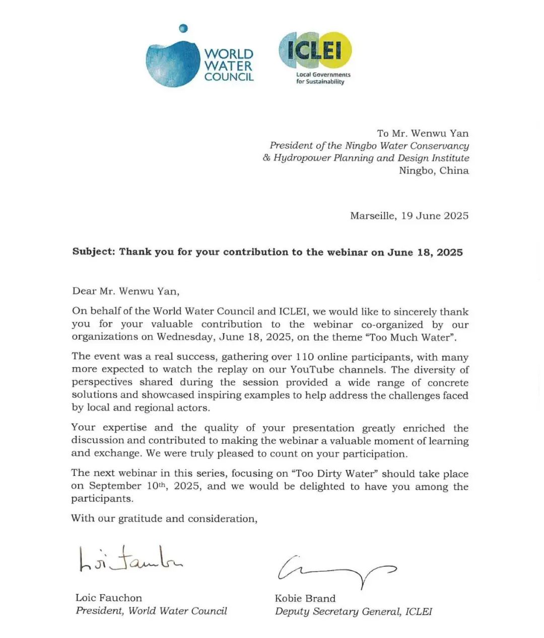 研討會(huì)圓滿落幕后,世界水理事會(huì)特向嚴(yán)文武院長(zhǎng)發(fā)來感謝信,并盛情邀請(qǐng)其參加下一屆研討會(huì)。