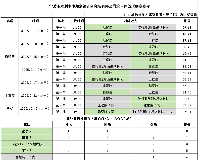 八月盛夏,激情點(diǎn)燃。寧波市水利院第三屆"智慧杯"職工籃球聯(lián)賽在集士港體育公園籃球場(chǎng)火熱開(kāi)幕!這不僅是一場(chǎng)競(jìng)技的較量,更是一次寧波院人團(tuán)結(jié)拼搏、斗志昂揚(yáng)的集中展現(xiàn)。經(jīng)過(guò)兩個(gè)月的鏖戰(zhàn),最終勘察院隊(duì)強(qiáng)勢(shì)問(wèn)鼎冠軍,建管院隊(duì)與院行政部門&規(guī)劃聯(lián)隊(duì)分別獲得亞軍、季軍?,F(xiàn)在,就讓我們一同回顧這段充滿汗水與激情的籃球時(shí)光!