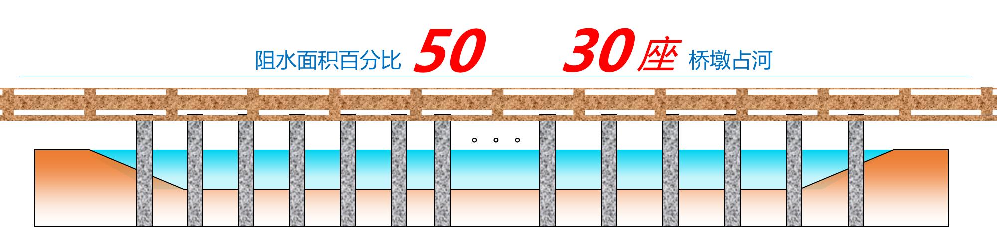 根據(jù)原設(shè)計(jì),共有30座橋墩占用河道, 20年一遇設(shè)計(jì)水位條件下,橋墩阻水面積百分比達(dá)到50%以上,不符合《浙江省涉河橋梁水利技術(shù)規(guī)定》關(guān)于“跨越III級及以下堤防以及無堤防河道的橋梁的阻水面積百分比不宜大于6%,不得超過8%。”的要求