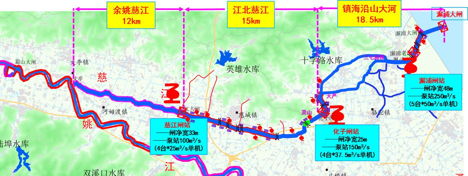 姚江東排工程(即姚江二通道(慈江)工程)西起慈江大閘,經江北、鎮(zhèn)海沿山大河,自西向東由澥浦大閘外排入杭州灣,工程全長約34km,研究為有效克服土地、資金、工期等一系列要素制約問題,創(chuàng)新性引入“高速水路———梯級泵站排水”設計理念,切實解決了濱海平原地區(qū)自流排水易受外海潮位頂托和河道輸水流速低、排水慢等問題,該方案于2015年11月經寧波市人民政府第70次常委會議審議通過,并納入省委省政府、市委市政府確定的姚江奉化江流域洪澇治理“6+1”工程。