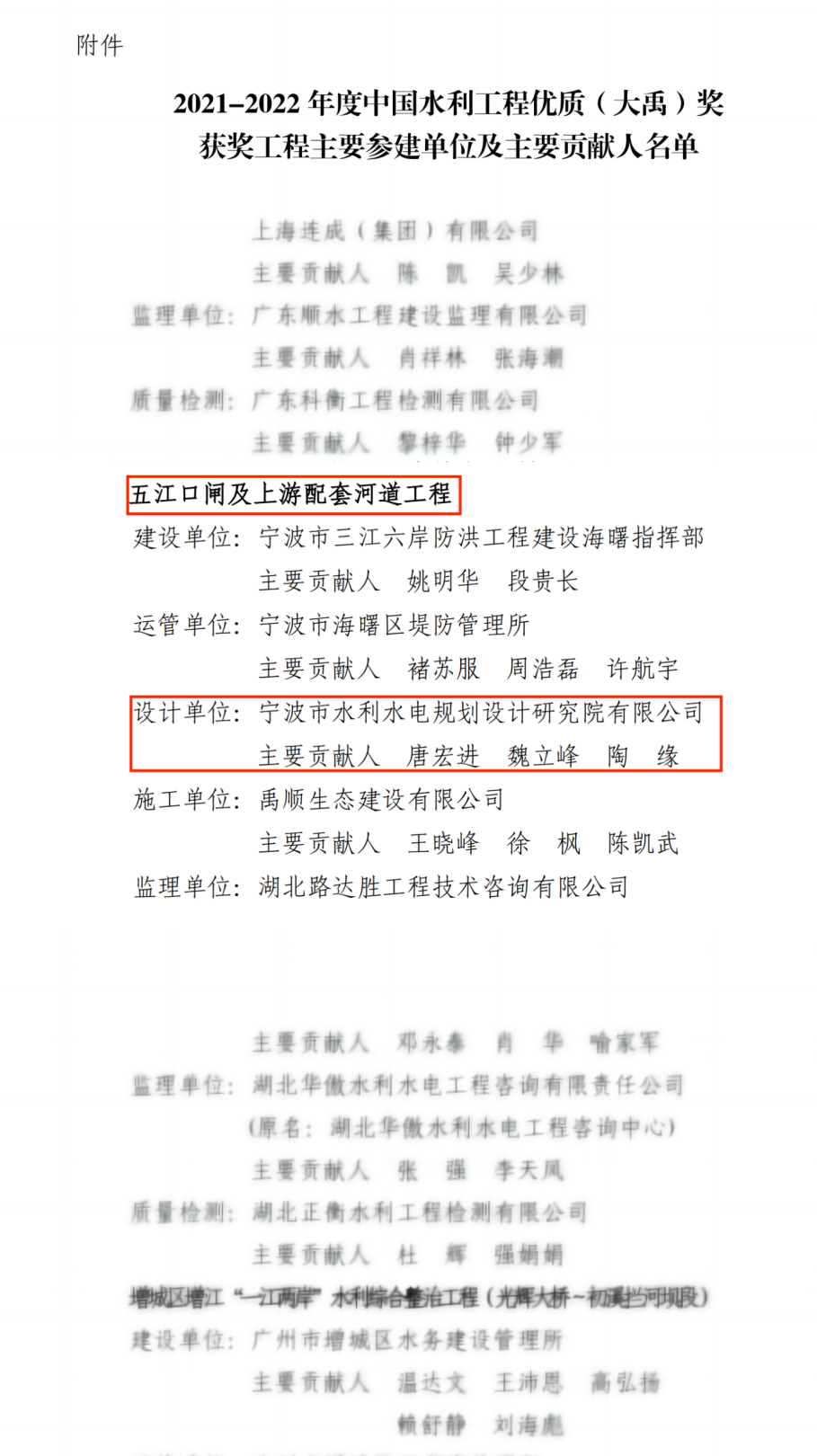 近日,2021年~2022年度中國水利工程優(yōu)質(zhì)(大禹)獎(jiǎng)獲獎(jiǎng)名單出爐,36個(gè)獲獎(jiǎng)工程中,我院成功鎖定一席!此次我院設(shè)計(jì)的五江口閘及上游配套河道工程,是我院第七個(gè)榮獲大禹獎(jiǎng)的項(xiàng)目。