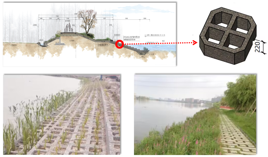 為了保證水體交換同時(shí)防御土體掏刷,工程迎水側(cè)護(hù)坡采用多孔混凝土生態(tài)護(hù)坡磚,不僅防沖固土,也利于水生動(dòng)植物生長(zhǎng),營(yíng)造自然、生態(tài)的水岸環(huán)境。