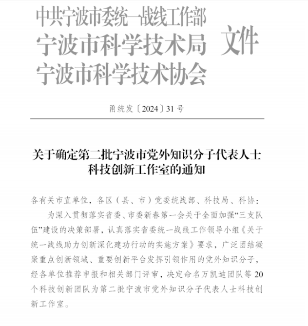 近日,寧波市統(tǒng)一戰(zhàn)線助力創(chuàng)新深化建功行動(dòng)啟動(dòng)儀式在寧波院士中心舉行。啟動(dòng)儀式上,市委常委、統(tǒng)戰(zhàn)部部長林雅蓮為第二批寧波市黨外知識分子科技創(chuàng)新工作室團(tuán)隊(duì)授牌。寧波市黨外知識分子科技創(chuàng)新工作室由市委統(tǒng)戰(zhàn)部會(huì)同市科技局、寧波市科協(xié)認(rèn)定。我院張預(yù)定創(chuàng)新工作室位列其中。